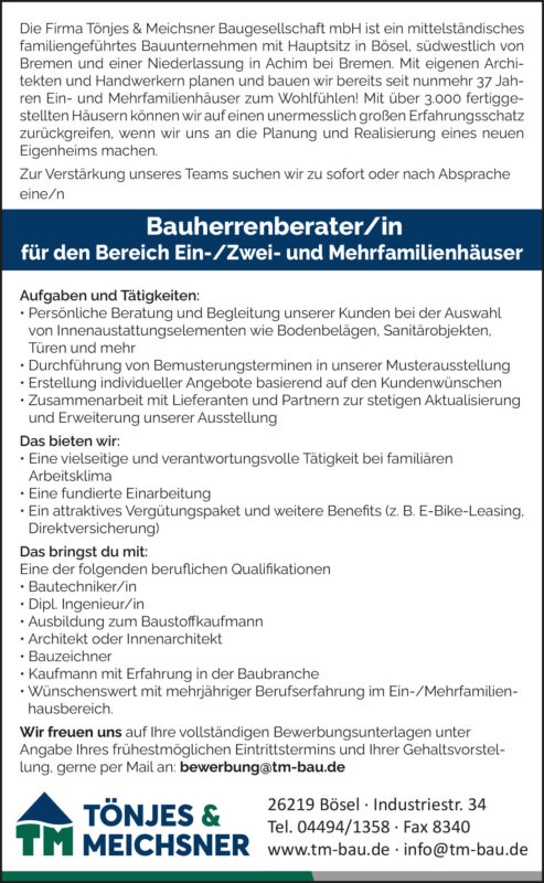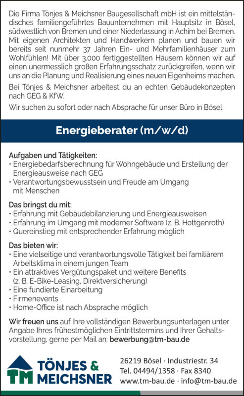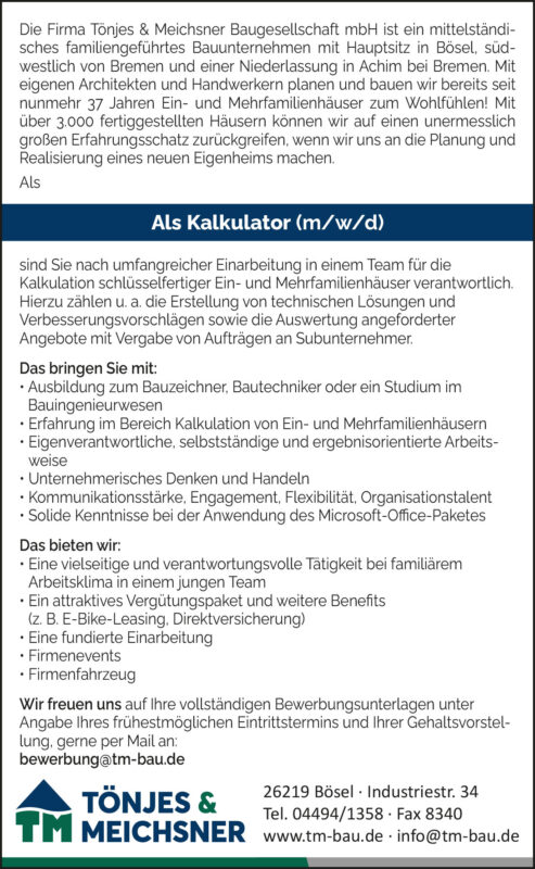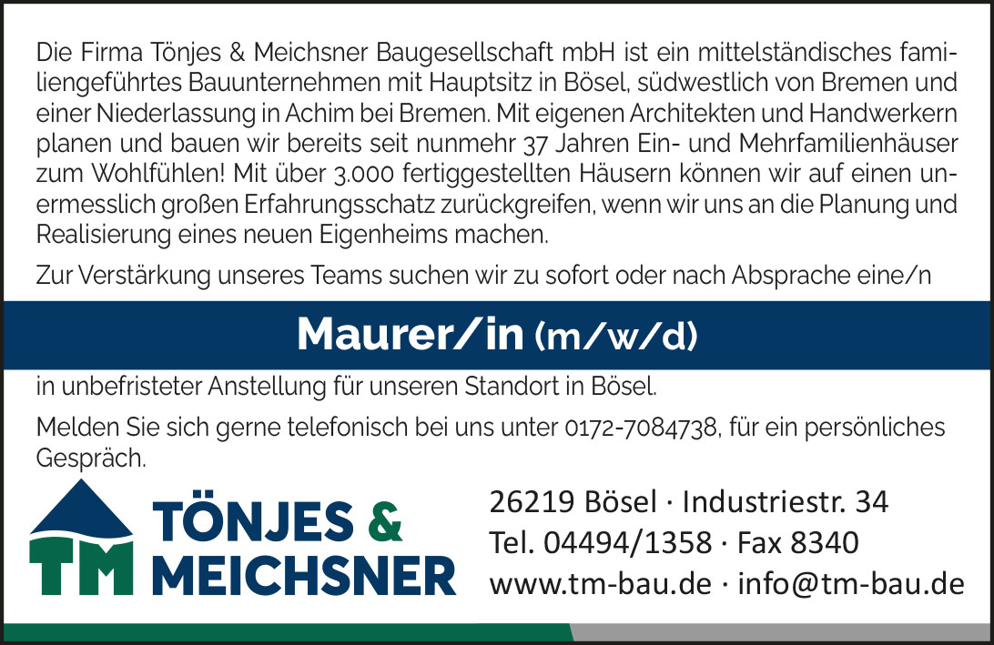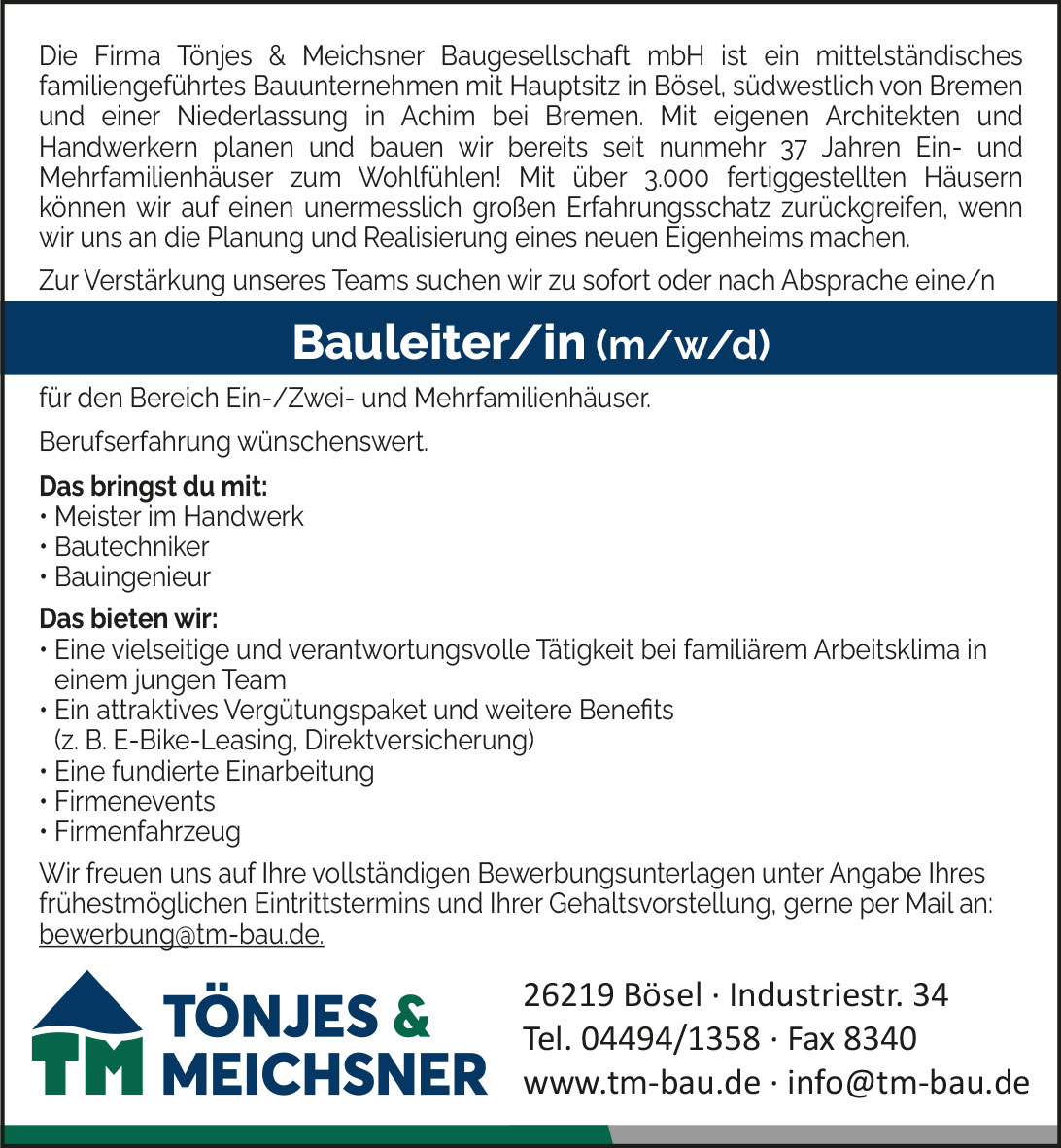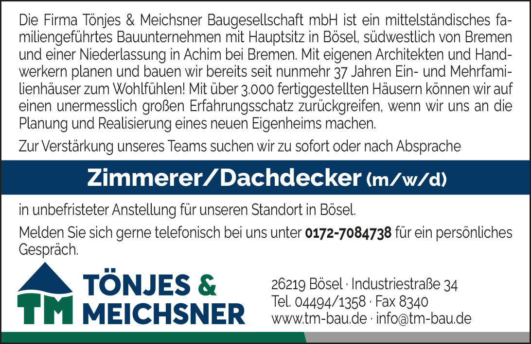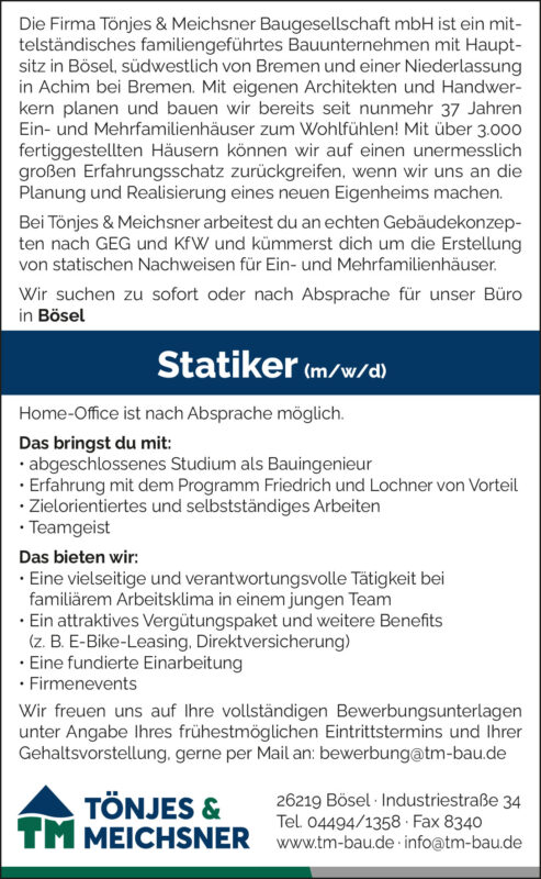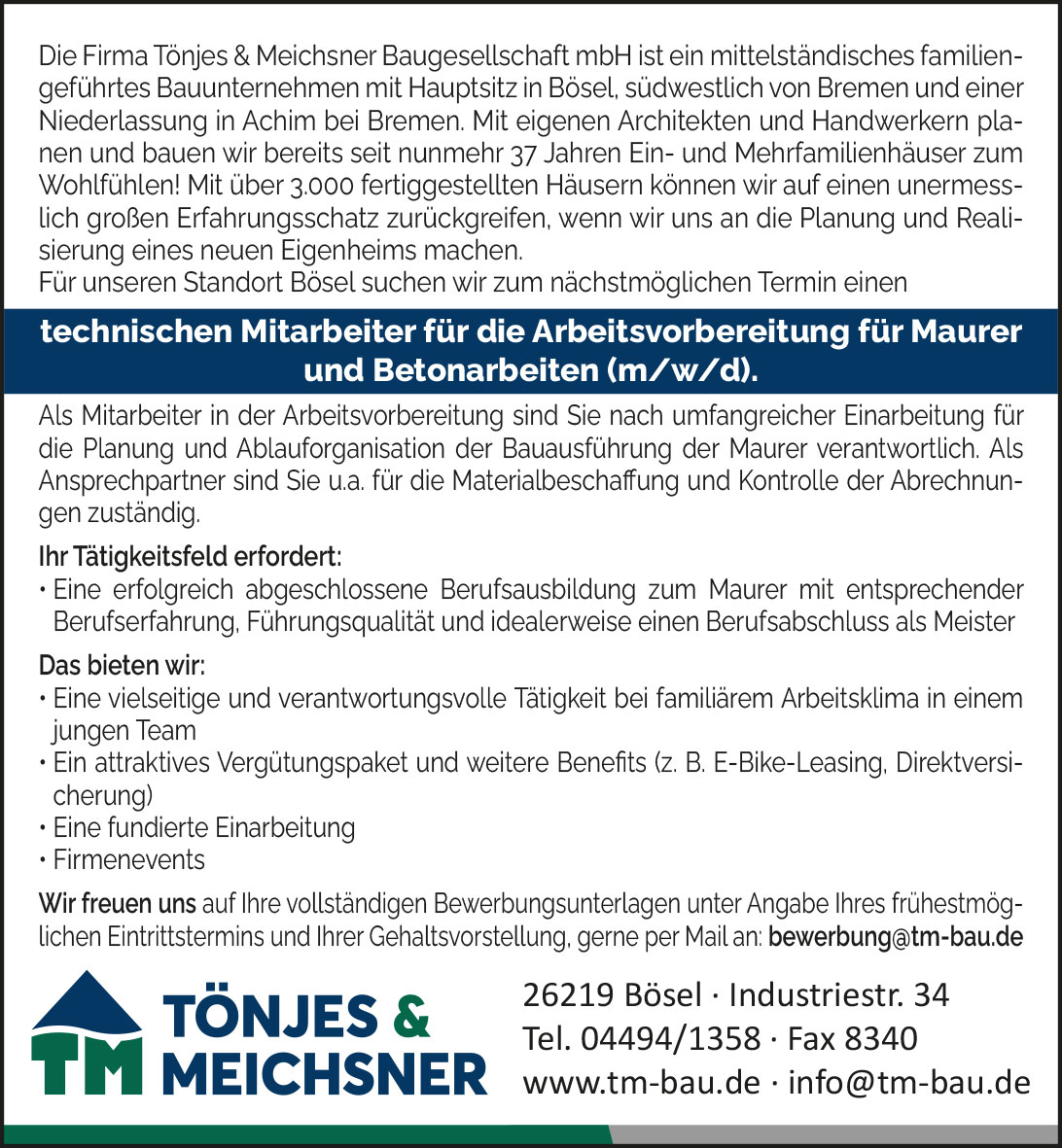 Interessiert? Dann schicke eine Kurzbewerbung an die info@tm-bau.de oder rufe uns ganz unkompliziert an: 04494-1358
